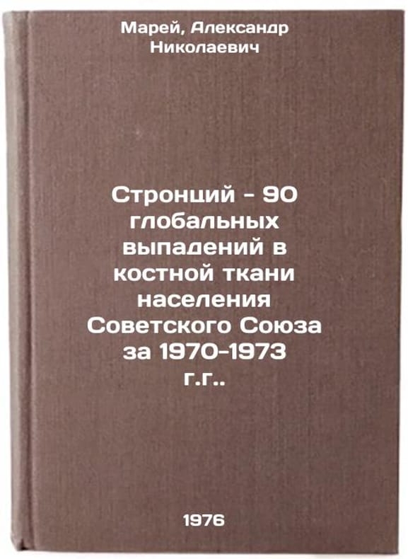 In Russian. Marey, Alexander Nikolaevich. Strontium - 90 global bone prolapses in the Soviet Union population, 1970-1973. Moscow: 1976. Strontsiy - 90 global'nykh vypadeniy v kostnoy tkani naseleniya Sovetskogo Soyuza za 1970-1973 gg. In Russian /Strontium - 90 global bone prolapses in the Soviet Union population, 1970-1973 . All images are for identification of editions only. Several books of the same edition may be available. Please feel free to request photos of available books. SKU7024464