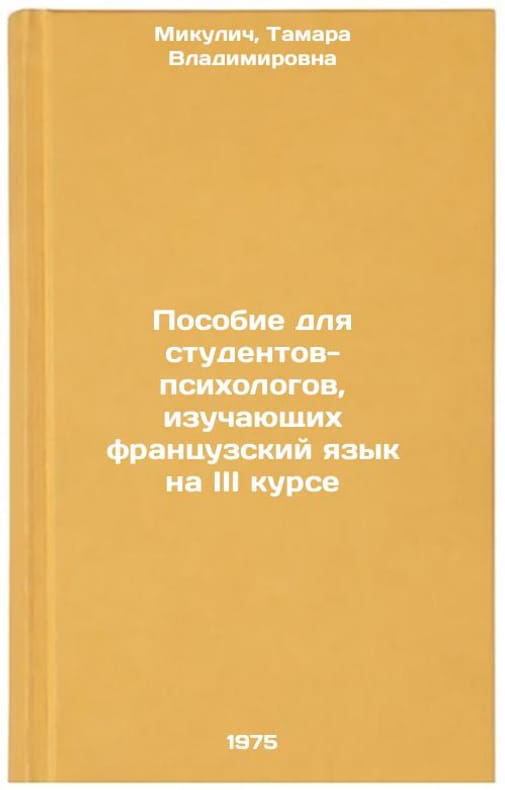 In Russian. Mikulich, Tamara Vladimirovna. Manual for students-psychologists studying French in the third year. Yaroslavl: 1975. Posobie dlya studentov-psikhologov, izuchayushchikh frantsuzskiy yazyk na III kurse. In Russian /Handbook for third-year psychology students studying French. All images are for identification of editions only. Several books of the same edition may be available. Please feel free to request photos of available books. SKU7025076