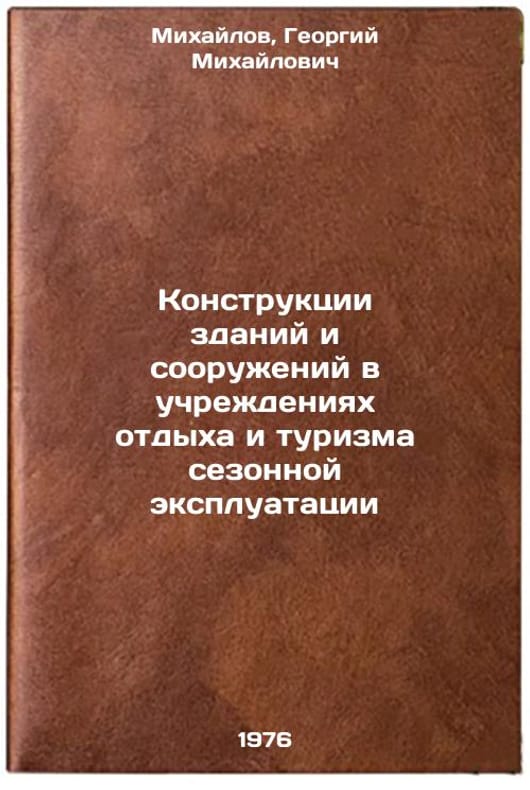 In Russian. Mikhailov, Georgy Mikhailovich. Structures of buildings and structures in recreation and tourism establishments of seasonal operation. Moscow: Central STI for city design and architecture, 1976. Konstruktsii zdaniy i sooruzheniy v uchrezhdeniyakh otdykha i turizma sezonnoy ekspluatatsii. In Russian /Structures of buildings and structures in recreation and tourism establishments of seasonal operation . All images are for identification of editions only. Several books of the same edition may be available. Please feel free to request photos of available books. SKU7025860