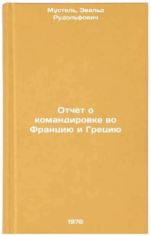 In Russian. Mustel, Evald Rudolfovich. Report on his mission to France and Greece. Moscow: 1976. Otchet o komandirovke vo Frantsiyu i Gretsiyu. In Russian /Report on mission to France and Greece . All images are for identification of editions only. Several books of the same edition may be available. Please feel free to request photos of available books. SKU7028525