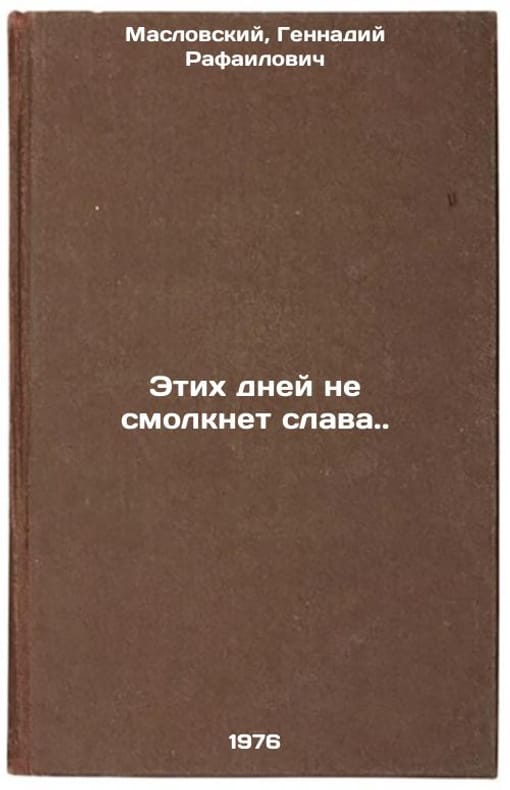 In Russian. Maslovsky, Gennady Rafailovich. These days the glory will not fade. Moscow: State Film Propaganda Bureau, 1976. All images are for identification of editions only. Several books of the same edition may be available. Please feel free to request photos of available books. SKU7031788