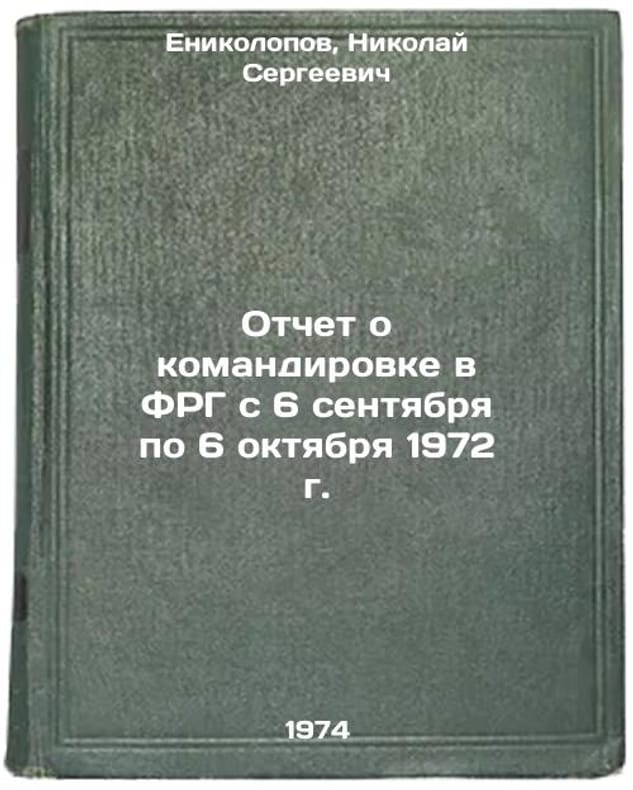 In Russian. Enikolopov, Nikolai Sergeevich. Report on his mission to Germany from 6 September to 6 October 1972. Moscow: 1974. Otchet o komandirovke v FRG s 6 sentyabrya po 6 oktyabrya 1972 g. In Russian /Report on his mission to Germany from 6 September to 6 October 1972. All images are for identification of editions only. Several books of the same edition may be available. Please feel free to request photos of available books. SKU7038584
