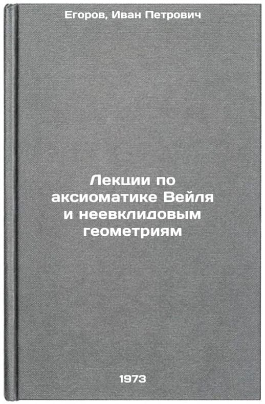 In Russian. Egorov, Ivan Petrovich. Lectures on Weil axiomatics and non-Euclidean geometry. Ryazan: 1973. Lektsii po aksiomatike Veylya i neevklidovym geometriyam. In Russian/Lectures on Weil axiomatics and non-Euclidean geometry. All images are for identification of editions only. Several books of the same edition may be available. Please feel free to request photos of available books. SKU7041506