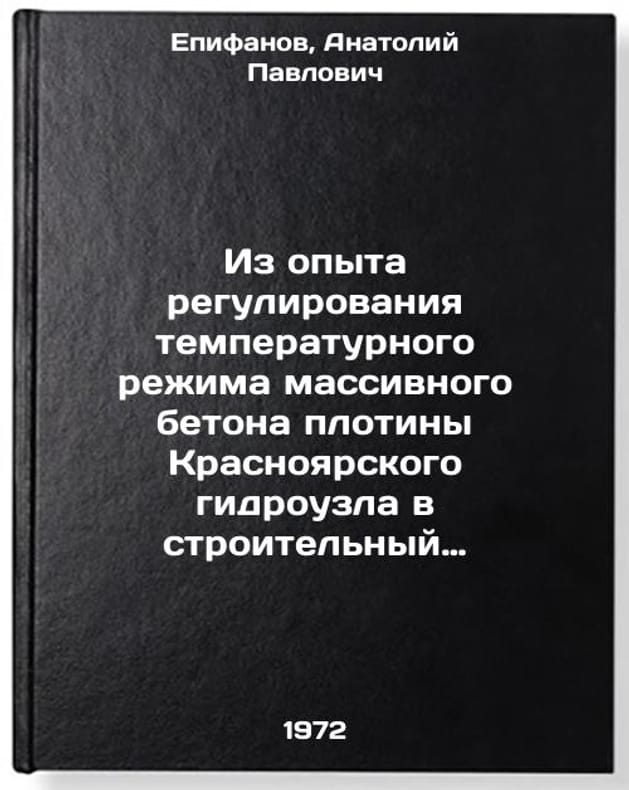 In Russian. Epifanov, Anatoly Pavlovich. From the experience of regulating the temperature regime of the massive concrete of the Krasnoyarsk hydroelectric dam during the construction period. Moscow: 1972. Iz opyta regulirovaniya temperaturnogo rezhima massivnogo betona plotiny Krasnoyarskogo gidrouzla v stroitelnyy period. In Russian/From the experience of regulating the temperature of the massive concrete of the Krasnoyarsk hydroelectric dam during the construction period. All images are for identification of editions only. Several books of the same edition may be available. Please feel free to request photos of available books. SKU7041902