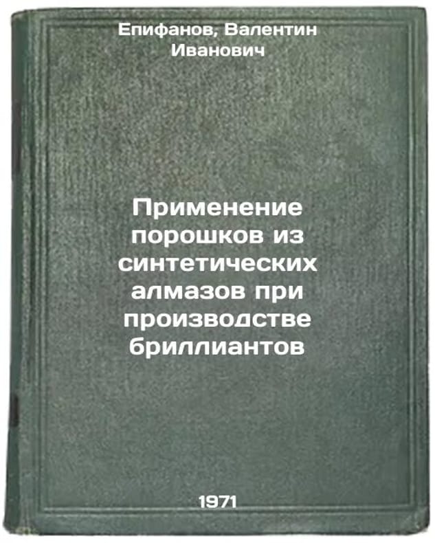 In Russian. Epifanov, Valentin Ivanovich. Use of synthetic diamond powders in diamond production. Kyiv: 1971. Primenenie poroshkov iz sinteticheskikh almazov pri proizvodstve brilliantov. In Russian /The use of synthetic diamond powders in diamond production . All images are for identification of editions only. Several books of the same edition may be available. Please feel free to request photos of available books. SKU7041912