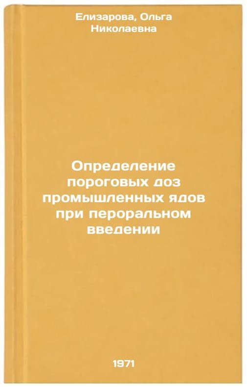 In Russian. Elizarova, Olga Nikolaevna. Determination of oral dose thresholds for industrial poisons. Moscow: Medicine, 1971. Opredelenie porogovykh doz promyshlennykh yadov pri peroral'nom vvedenii. In Russian /Determination of dose thresholds for industrial poisons by oral administration . All images are for identification of editions only. Several books of the same edition may be available. Please feel free to request photos of available books. SKU7044746