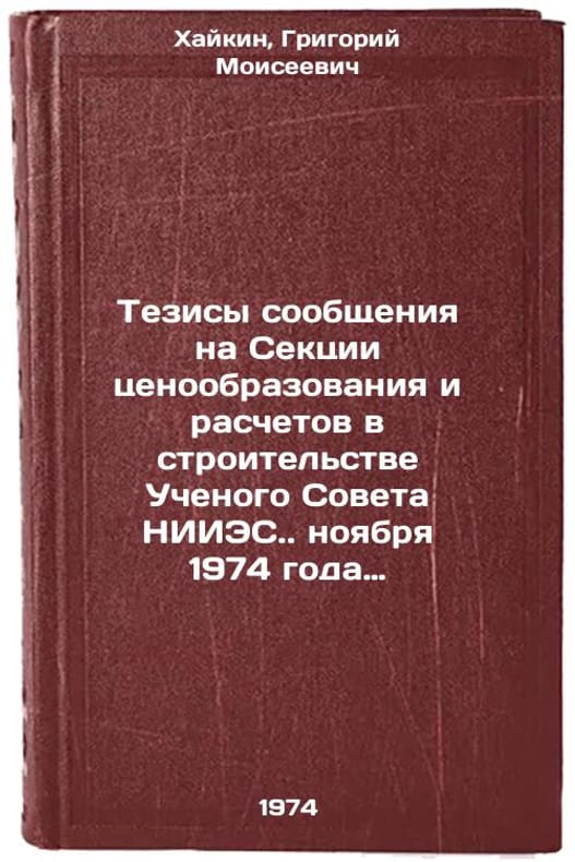 In Russian. Khaikin, Grigory Moiseevich. Theses of communication at the Section of Pricing and Settlements in Construction of the Scientific Council of the NIIES. of November 1974, based on the result of 5-d-1 of the research work of the NIIES Gosstroy USSR for 1974 To prepare proposals for improving zoning of estimated prices for materials with the development of new models of estimated prices in some parts of the country. Moscow: 1974. Tezisy soobshcheniya na Sektsii tsenoobrazovaniya i raschetov v stroitel'stve Uchenogo Soveta NIIES. noyabrya 1974 goda po rezul'tatu 5kh-d-1 lana nauchno-issledovatel'skikh rabot NIIES Gosstroya SSSR na 1974 god Podgotovit' predlozheniya po sovershenstvovaniyu zonirovaniya smetnykh tsen na materialy s razrabotkoy novykh modeley smetnykh tsen v. In Russian /Theses of communication at the Construction Pricing and Settlement Section of the Scientific Council of the NIIES. of November 1974, based on the result of 5-d-1 of the research work of the NIIES Gosstroy USSR for 1974 To prepare proposals for improving zoning of estimated prices for materials with the development of new models of estimated prices in some parts of the country. All images are for identification of editions only. Several books of the same edition may be available. Please feel free to request photos of available books. SKU7051476