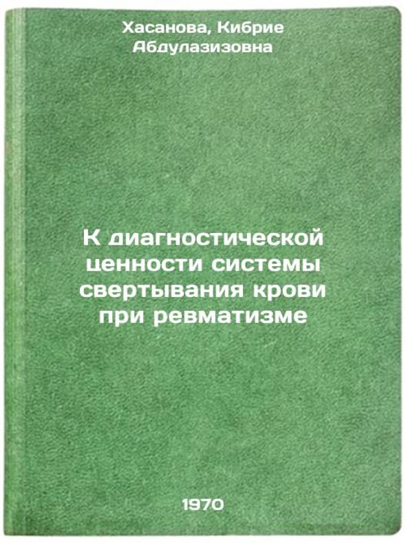 "Short description: In Russian. Khasanova, Kibriye Abdulazizovna. To the diagnostic value of a blood clotting system in rheumatism. Dushanbe: 1970. K diagnosticheskoy tsennosti sistemy svertyvaniya krovi pri revmatizme. In Russian /Towards the Diagnostic Value of Blood Clotting System in Rheumatism . All images are for identification of editions only. Several books of the same edition may be available. Please feel free to request photos of available books. SKU7054145"