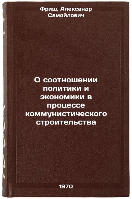 In Russian. Frisch, Alexander Samoilovich. On the relationship between politics and economics in the process of communist construction. Moscow: Znanie, 1970. O sootnoshenii politiki i ekonomiki v protsesse kommunisticheskogo stroitel'stva. In Russian /On the relationship between politics and economics in the process of communist construction . All images are for identification of editions only. Several books of the same edition may be available. Please feel free to request photos of available books. SKU7067011