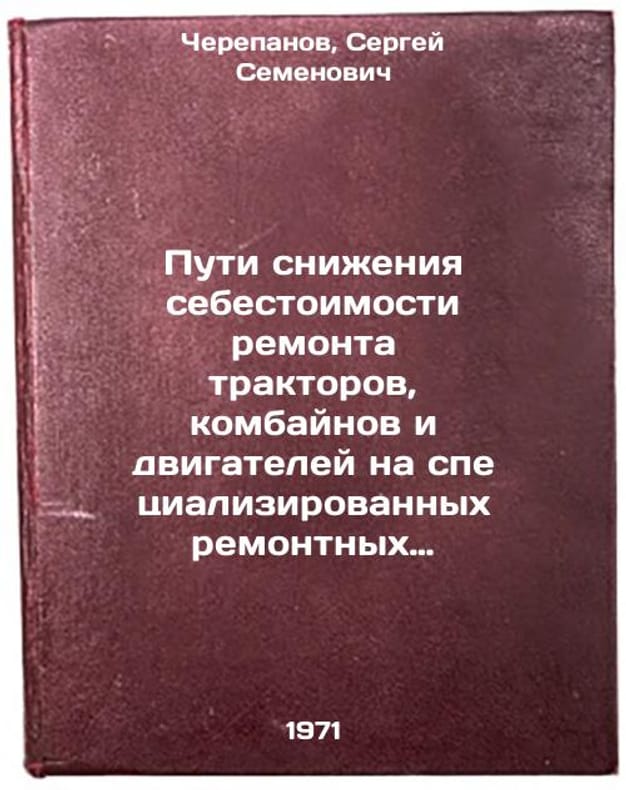 In Russian. Cherepanov, Sergey Semenovich. Ways to reduce the cost of repairing tractors, combine harvesters and engines at specialized repair enterprises of the agricultural equipment system. Moscow: 1971. Puti snizheniya sebestoimosti remonta traktorov, kombaynov i dvigateley na spetsializirovannykh remontnykh predpriyatiyakh sistemy sel'khoztekhnika. In Russian /Ways to reduce the cost of repairing tractors, combine harvesters and engines at specialized repair enterprises of the agricultural machinery system . All images are for identification of editions only. Several books of the same edition may be available. Please feel free to request photos of available books. SKU7069269