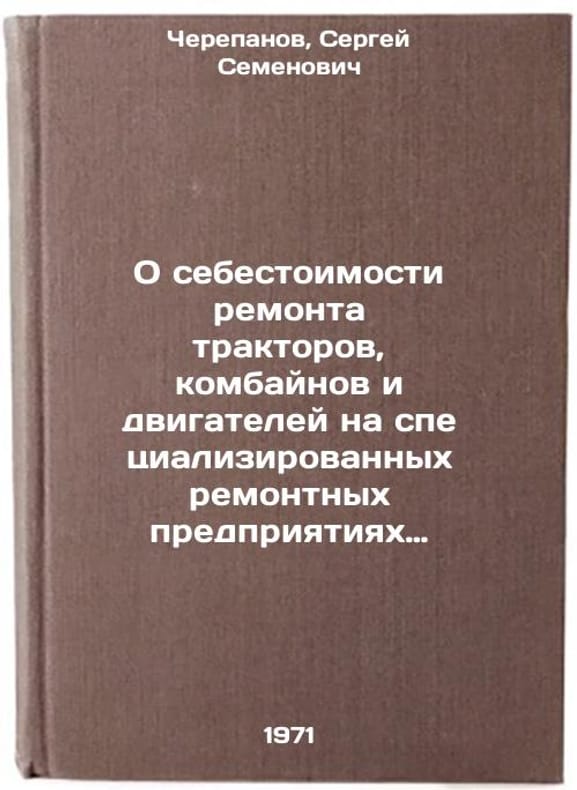 In Russian. Cherepanov, Sergey Semenovich. On the prime cost of repairing tractors, combine harvesters and engines at specialized repair enterprises of the Selkhoztekhnika system and ways to reduce it. Moscow: 1971. O sebestoimosti remonta traktorov, kombaynov i dvigateley na spetsializirovannykh remontnykh predpriyatiyakh sistemy Sel'khoztekhnika i putyakh ee snizheniya. In Russian /On the prime cost of repairing tractors, combine harvesters and engines at specialized repair enterprises of the Rallkhoztekhnika system and ways to reduce it . All images are for identification of editions only. Several books of the same edition may be available. Please feel free to request photos of available books. SKU7069271