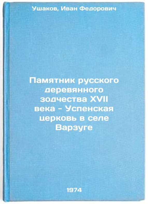 In Russian. Ushakov, Ivan Fedorovich. Monument to Russian wooden architecture of the seventeenth century - Assumption Church in the village of Varzuge. Murmansk: Book of Editions, 1974. Pamyatnik russkogo derevyannogo zodchestva XVII veka - Uspenskaya tserkov' v sele Varzuge. In Russian /Monument to 17th century Russian wooden architecture - Assumption Church in the village of Varzuge. All images are for identification of editions only. Several books of the same edition may be available. Please feel free to request photos of available books. SKU7081685