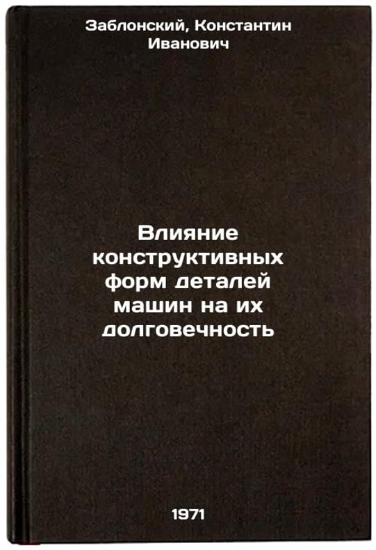 In Russian. Zablonsky, Konstantin Ivanovich. Influence of structural forms of machine parts on their durability. Kyiv: Technica, 1971. Vliyanie konstruktivnykh form detaley mashin na ikh dolgovechnost'. In Russian /Influence of the structural shapes of machine parts on their durability . All images are for identification of editions only. Several books of the same edition may be available. Please feel free to request photos of available books. SKU7083336