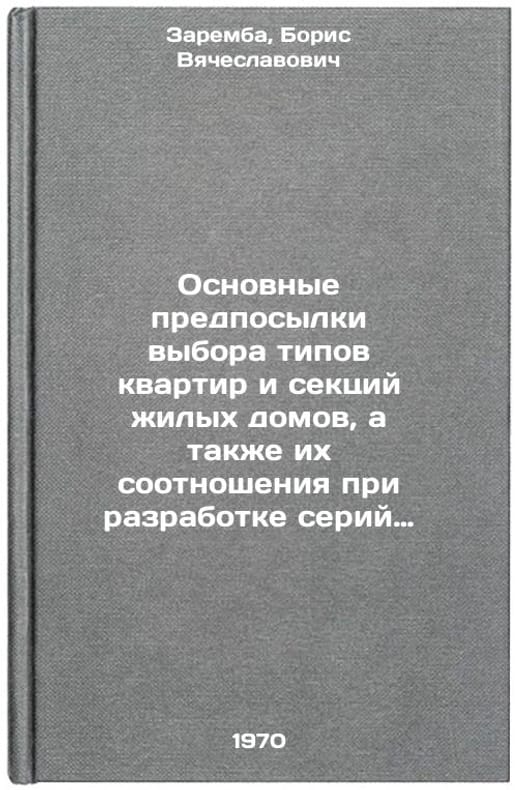 In Russian. Zaremba, Boris Vyacheslavovich. The basic prerequisites for choosing types of apartments and sections of residential buildings, as well as their correlation in the development of a series of standard projects. Moscow: Centre for Scientific and Technical Information on Urban Construction and Architecture, 1970. Osnovnye predposylki vybora tipov kvartir i sektsiy zhilykh domov, a takzhe ikh sootnosheniya pri razrabotke seriy tipovykh proektov. In Russian /Basic prerequisites for the selection of apartment types and sections of dwelling houses, as well as their ratio in the development of a series of model projects . All images are for identification of editions only. Several books of the same edition may be available. Please feel free to request photos of available books. SKU7086391