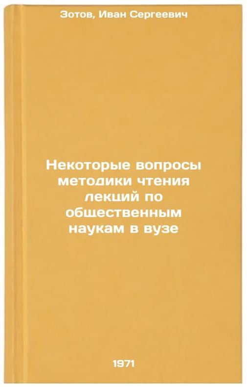 In Russian. Zotov, Ivan Sergeevich. Some Questions of the Methodology of Lecturing in Social Sciences at Higher Education. Moscow: 1971. Nekotorye voprosy metodiki chteniya lektsiy po obshchestvennym naukam v vuze. In Russian /Some Issues in the Methodology of Lecturing Social Sciences at Higher Education . All images are for identification of editions only. Several books of the same edition may be available. Please feel free to request photos of available books. SKU7091307