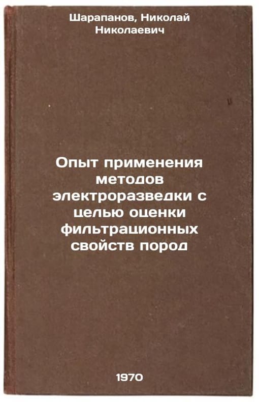 In Russian. Sharapanov, Nikolai Nikolaevich. Experience in the Application of Electrical Exploration Methods to Evaluate the Filtering Properties of Rocks. Moscow: 1970. Opyt primeneniya metodov elektrorazvedki s tsel'yu otsenki fil'tratsionnykh svoystv porod. In Russian /Experience with electric prospecting techniques to assess the filtration properties of rocks . All images are for identification of editions only. Several books of the same edition may be available. Please feel free to request photos of available books. SKU7093183