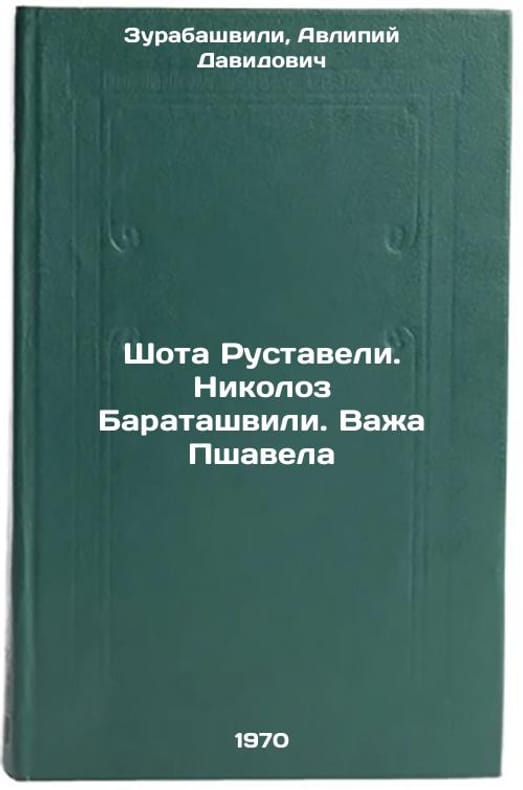 In Russian. Zurabashvili, Avlipiy Davidovich. Shota Rustaveli. Nikoloz Baratashvili. Vazha Pshavela. Tbilisi: 1970. Shota Rustaveli. Nikoloz Baratashvili. Vazha Pshavela. In Russian /Shota Rustaveli. Nikoloz Baratashvili. Vaja Pshavela . All images are for identification of editions only. Several books of the same edition may be available. Please feel free to request photos of available books. SKU7094437