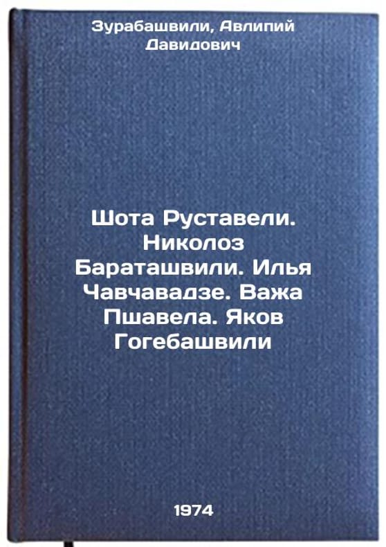 In Russian. Zurabashvili, Avlipiy Davidovich. Shota Rustaveli. Nikoloz Baratashvili. Ilya Chavchavadze. Vazha Pshavela. Yakov Gogebashvili. Tbilisi: Merani, 1974. Shota Rustaveli. Nikoloz Baratashvili. Il'ya Chavchavadze. Vazha Pshavela. Yakov Gogebashvili. In Russian /Shota Rustaveli. Nikoloz Baratashvili. Ilya Chavchavadze. Vazha Pshavela. Yakov Gogebashvili. All images are for identification of editions only. Several books of the same edition may be available. Please feel free to request photos of available books. SKU7094438