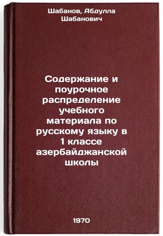 In Russian. Shabanov, Abdulla Shabanovich. Content and classroom distribution of Russian language teaching material in the first grade of an Azerbaijani school. Baku: Maarif, 1970. Soderzhanie i pourochnoe raspredelenie uchebnogo materiala po russkomu yazyku v 1 klasse azerbaydzhanskoy shkoly. In Russian /Content and classroom distribution of Russian language teaching material in the first grade of an Azerbaijani school . All images are for identification of editions only. Several books of the same edition may be available. Please feel free to request photos of available books. SKU7094962