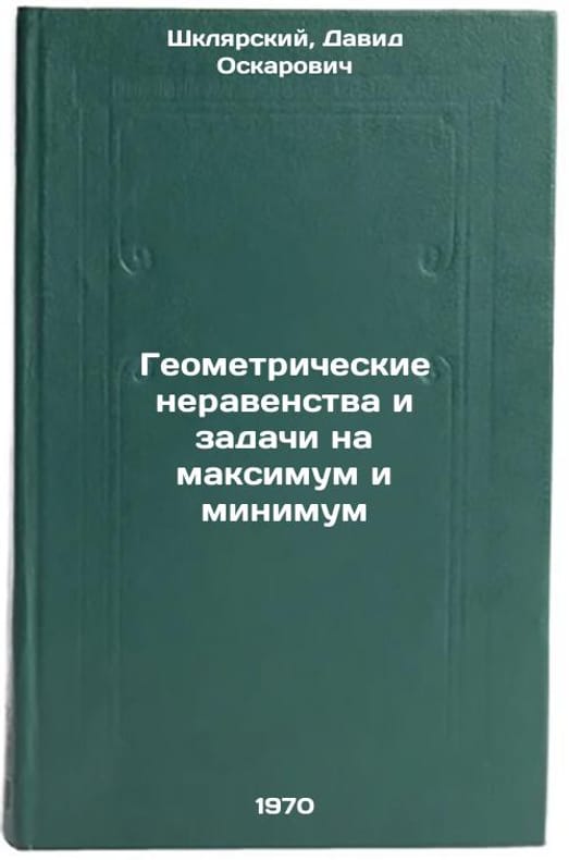 In Russian. Shklyarsky, David Oskarovich. Geometric inequalities and challenges at maximum and minimum. Moscow: Science, 1970. Geometricheskie neravenstva i zadachi na maksimum i minimum. In Russian /Geometric inequalities and challenges at maximum and minimum . All images are for identification of editions only. Several books of the same edition may be available. Please feel free to request photos of available books. SKU7100654