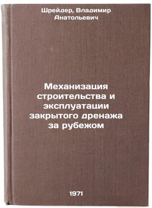 In Russian. Schrader, Vladimir Anatolievich. Mechanization of Construction and Operation of Closed Drainage Abroad. Moscow: 1971. Mekhanizatsiya stroitel'stva i ekspluatatsii zakrytogo drenazha za rubezhom. In Russian /Mechanization of the construction and operation of closed drainage systems abroad . All images are for identification of editions only. Several books of the same edition may be available. Please feel free to request photos of available books. SKU7102330