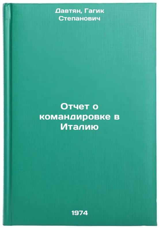 In Russian. Davtyan, Gagik Stepanovich. Report on mission to Italy. Moscow: 1974. All images are for identification of editions only. Several books of the same edition may be available. Please feel free to request photos of available books. SKU7104722
