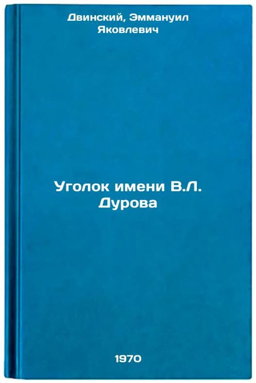 Short description: In Russian. Dvinsky, Emmanuil Yakovlevich. V. L. Durov Corner. Moscow: Moscow Worker, 1956. The image is provided for reference only. It may reflect condition of one of the available copies or only help in identifying the edition. Please feel free to contact us for a detailed description of the copies available. SKU5875371