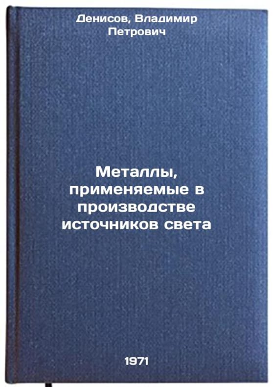 In Russian. Denisov, Vladimir Petrovich. Metals used in the production of light sources. Moscow: Department of Scientific and Technical Information in Electrical Engineering, VNIIEM, 1971. Metally, primenyaemye v proizvodstve istochnikov sveta. In Russian /Metals used in the production of light sources . All images are for identification of editions only. Several books of the same edition may be available. Please feel free to request photos of available books. SKU7108010