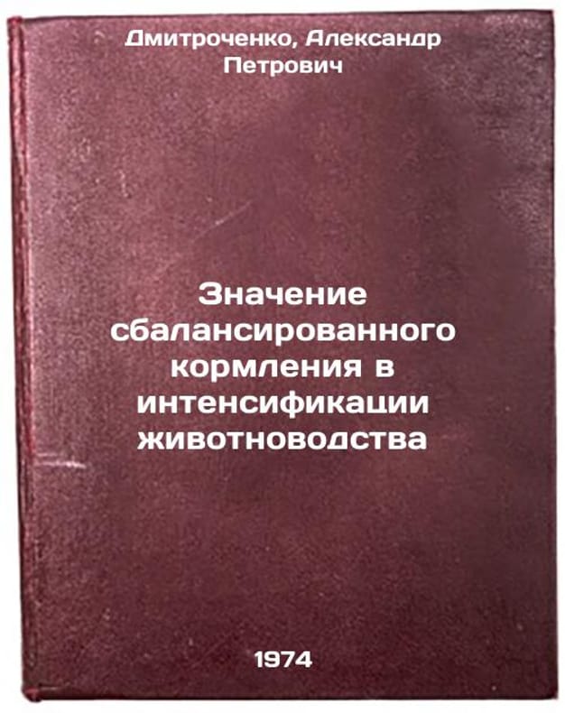 In Russian. Dmitrochenko, Alexander Petrovich. The importance of balanced feeding in the intensification of animal husbandry. Leningrad: 1974. Znachenie sbalansirovannogo kormleniya v intensifikatsii zhivotnovodstva. In Russian /The Importance of Balanced Feeding in Livestock Intensification. All images are for identification of editions only. Several books of the same edition may be available. Please feel free to request photos of available books. SKU7112868