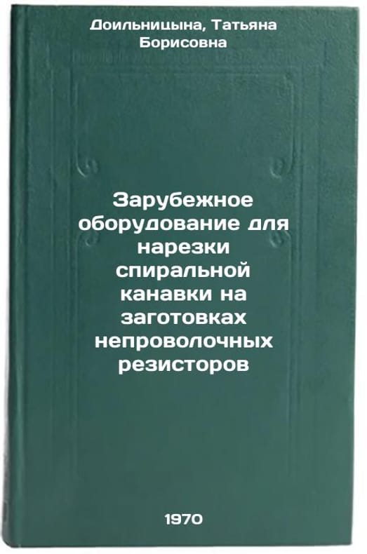 In Russian. Doilnitsyna, Tatyana Borisovna. Foreign equipment for cutting spiral grooves on the blanks of non-wire resistors. Moscow: 1970. Zarubezhnoe oborudovanie dlya narezki spiral'noy kanavki na zagotovkakh neprovolochnykh rezistorov. In Russian /Foreign equipment for cutting spiral grooves on non-wire resistors . All images are for identification of editions only. Several books of the same edition may be available. Please feel free to request photos of available books. SKU7113549