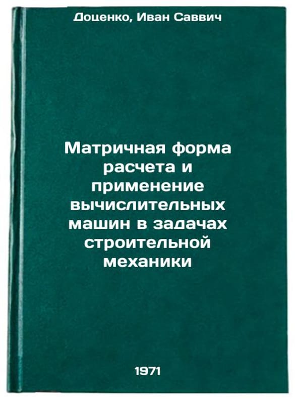 In Russian. Dotsenko, Ivan Savvich. Matrix form of calculation and application of computing machines in tasks of construction mechanics. Kyiv: Vishcha school, 1971. Matrichnaya forma rascheta i primenenie vychislitel'nykh mashin v zadachakh stroitel'noy mekhaniki. In Russian /The Matrix of Calculation and Application of Computing Machines in Problems of Construction Mechanics . All images are for identification of editions only. Several books of the same edition may be available. Please feel free to request photos of available books. SKU7115364