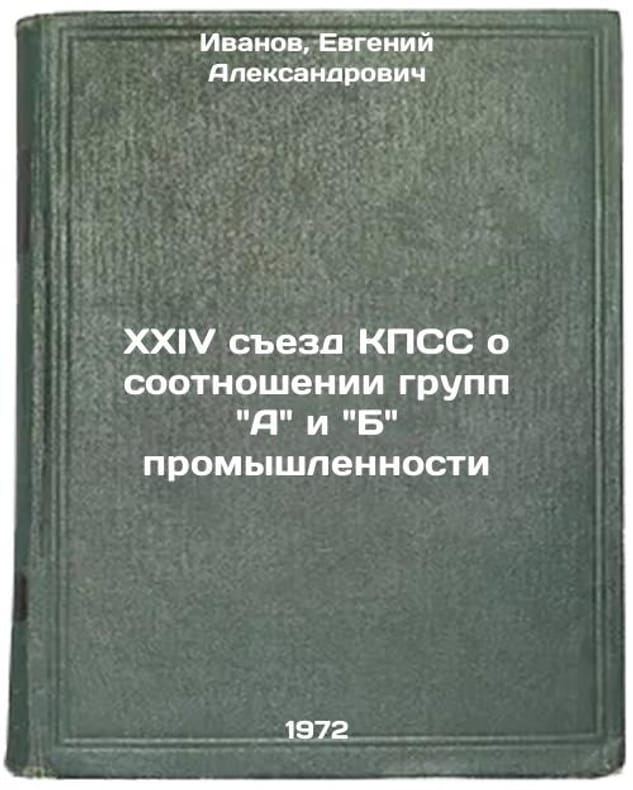 In Russian. Ivanov, Evgeny Aleksandrovich. XXIV Congress of the CPSU on the ratio of groups A and B of industry. Moscow: Economics, 1972. XXIV sezd KPSS o sootnoshenii grupp A i B promyshlennosti. In Russian/XXIV Congress of the CPSU on the ratio of groups A to B of industry. All images are for identification of editions only. Several books of the same edition may be available. Please feel free to request photos of available books. SKU7120591