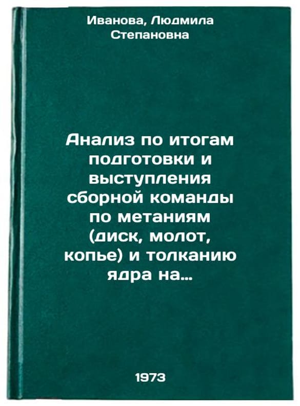 In Russian. Ivanova, Lyudmila Stepanovna. Analysis based on the results of the preparation and performance of the national team in throwing (discus, hammer, javelin) and shot put at the XX Olympic Games in Munich. Moscow: 1973. Analiz po itogam podgotovki i vystupleniya sbornoy komandy po metaniyam (disk, molot, kope) i tolkaniyu yadra na XX Olimpiyskikh igrakh v Myunkhene. In Russian/Analysis based on the results of the preparation and performance of the national team in throwing (discus, hammer, javelin) and shot put at the XX Olympic Games in Munich. All images are for identification of editions only. Several books of the same edition may be available. Please feel free to request photos of available books. SKU7121361