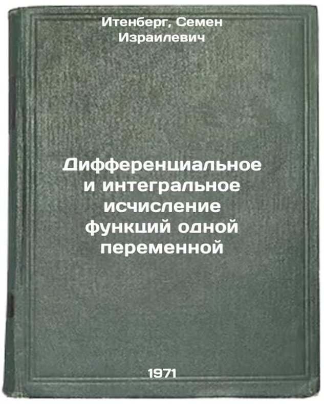 In Russian. Itenberg, Semyon Izrailevich. Differential and integral calculus of functions of one variable. Leningrad: 1971. Differentsial'noe i integral'noe ischislenie funktsiy odnoy peremennoy. In Russian /Differential and integral calculus of functions of one variable . All images are for identification of editions only. Several books of the same edition may be available. Please feel free to request photos of available books. SKU7132313