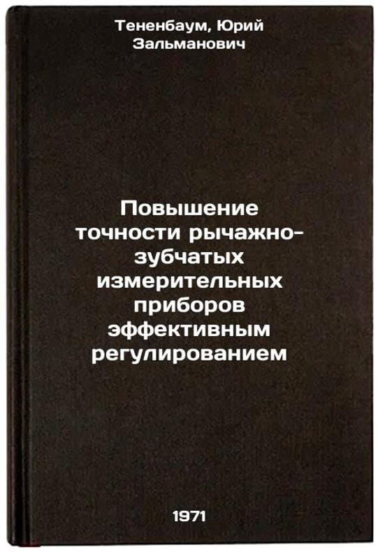 In Russian. Tenenbaum, Yuri Zalmanovich. Improving the accuracy of lever-gear measuring instruments by effective regulation. Leningrad: 1971. Povyshenie tochnosti rychazhno-zubchatykh izmeritel'nykh priborov effektivnym regulirovaniem. In Russian /Improving the accuracy of lever-gear measuring devices by effective regulation . All images are for identification of editions only. Several books of the same edition may be available. Please feel free to request photos of available books. SKU7136929