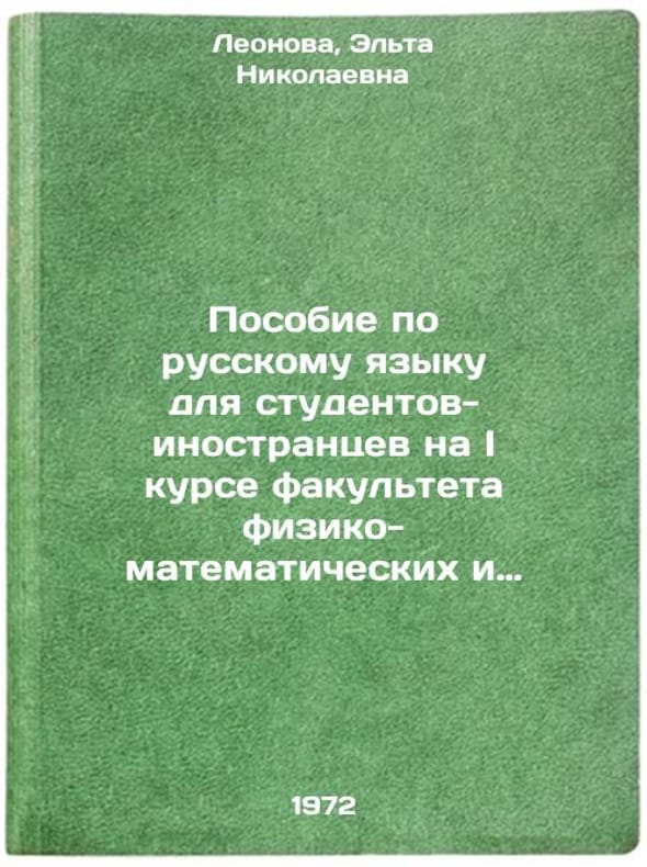 In Russian. Leonova, Elta Nikolaevna. A Russian language manual for foreign students in the first year of the Faculty of Physical, Mathematical and Natural Sciences. Moscow: 1972. Posobie po russkomu yazyku dlya studentov-inostrantsev na I kurse fakulteta fiziko-matematicheskikh i estestvennykh nauk. In Russian/A Russian language manual for foreign students in the first year of the Faculty of Physics, Mathematics and Natural Sciences. All images are for identification of editions only. Several books of the same edition may be available. Please feel free to request photos of available books. SKU7153322