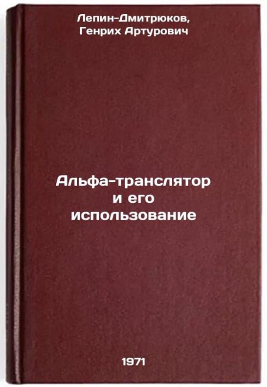 In Russian. Lepin-Dmitryukov, Genrikh Arturovich. Alpha-translator and its use. Leningrad: 1971. All images are for identification of editions only. Several books of the same edition may be available. Please feel free to request photos of available books. SKU7153437