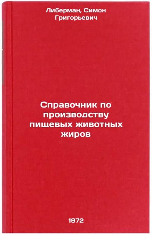 In Russian. Lieberman, Simon Grigoryevich. Guide to the Production of Edible Animal Fats. Moscow: Food Industry, 1972. Spravochnik po proizvodstvu pishchevykh zhivotnykh zhirov. In Russian/Guide to the production of edible animal fats. All images are for identification of editions only. Several books of the same edition may be available. Please feel free to request photos of available books. SKU7155336