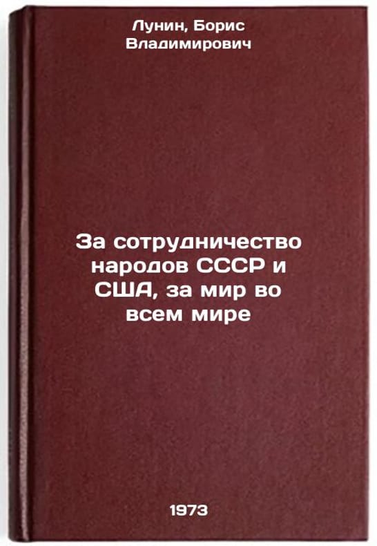 In Russian. Lunin, Boris Vladimirovich. For cooperation between the peoples of the USSR and the United States, for world peace. Tashkent: Uzbekistan, 1973. Za sotrudnichestvo narodov SSSR i SShA, za mir vo vsem mire. In Russian/For Cooperation between the Peoples of the USSR and the United States, for World Peace. All images are for identification of editions only. Several books of the same edition may be available. Please feel free to request photos of available books. SKU7160247