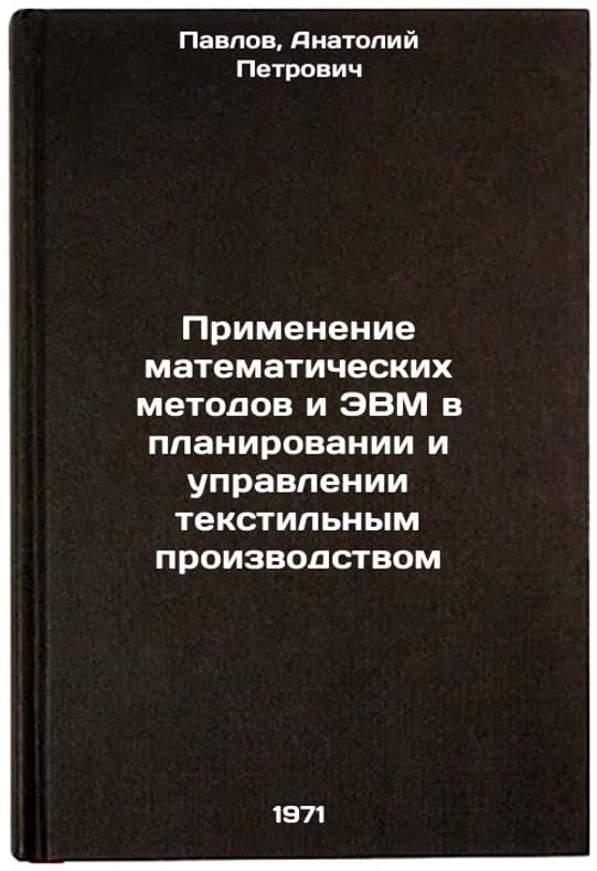 In Russian. Pavlov, Anatoly Petrovich. Application of mathematical methods and computers in the planning and management of textile production. Moscow: Light Industry, 1971. Primenenie matematicheskikh metodov i EVM v planirovanii i upravlenii tekstil'nym proizvodstvom. In Russian /Application of mathematical methods and computers in the planning and management of textile production . All images are for identification of editions only. Several books of the same edition may be available. Please feel free to request photos of available books. SKU7315475