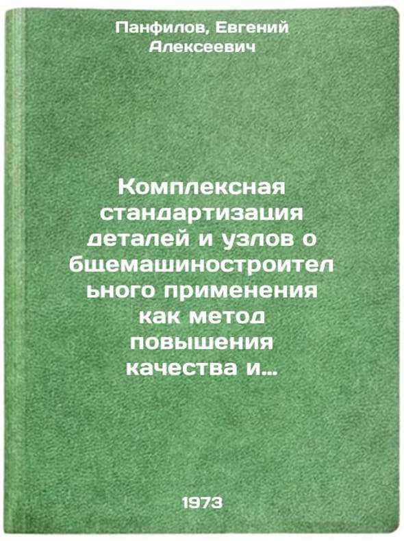 In Russian. Panfilov, Evgeny Alekseevich. Comprehensive standardization of parts and assemblies for general machine-building applications as a method of improving the quality and reliability of machines and products. Moscow: Znanie, 1973. Kompleksnaya standartizatsiya detaley i uzlov obshchemashinostroitelnogo primeneniya kak metod povysheniya kachestva i nadezhnosti mashin i izdeliy. In Russian/Integrated standardization of parts and components for general mechanical engineering applications as a method to improve the quality and reliability of machines and products. All images are for identification of editions only. Several books of the same edition may be available. Please feel free to request photos of available books. SKU7317835
