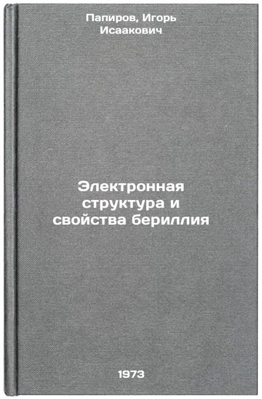 In Russian. Papirov, Igor Isaakovich. Electronic structure and properties of beryllium. Kharkov: 1973. Elektronnaya struktura i svoystva berilliya. In Russian/Electronic structure and properties of beryllium. All images are for identification of editions only. Several books of the same edition may be available. Please feel free to request photos of available books. SKU7319316