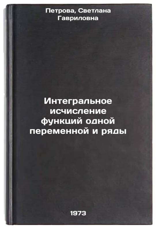 In Russian. Petrova, Svetlana Gavrilovna. Integral calculus of functions of one variable and series. Leningrad: 1973. Integralnoe ischislenie funktsiy odnoy peremennoy i ryady. In Russian/Integral computation of functions of one variable and series. All images are for identification of editions only. Several books of the same edition may be available. Please feel free to request photos of available books. SKU7323617