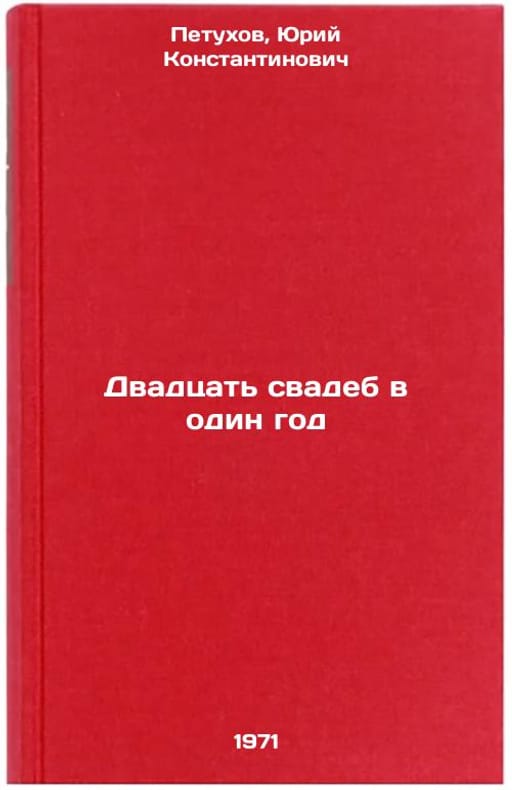 In Russian. Petukhov, Yuri Konstantinovich. Twenty weddings in one year. Moscow: 1971. All images are for identification of editions only. Several books of the same edition may be available. Please feel free to request photos of available books. SKU7324037