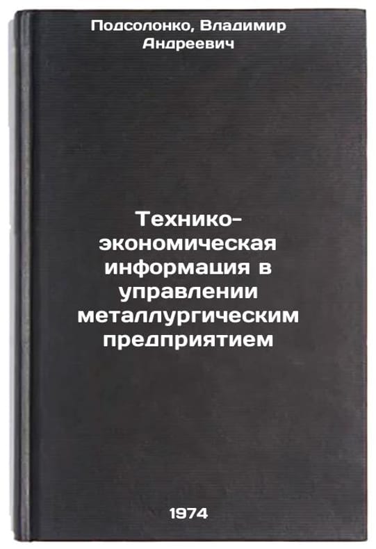 In Russian. Podsolonko, Vladimir Andreevich. Technical and economic information in the management of a metallurgical enterprise. Moscow: Metallurgy, 1974. Tekhniko-ekonomicheskaya informatsiya v upravlenii metallurgicheskim predpriyatiem. In Russian /Techno-economic information in the management of a metallurgical plant. All images are for identification of editions only. Several books of the same edition may be available. Please feel free to request photos of available books. SKU7328974