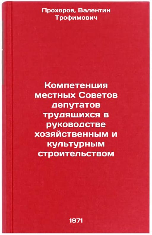 In Russian. Prokhorov, Valentin Trofimovich. The Competence of Local Councils of Workers Deputies in Managing Economic and Cultural Construction. Moscow: Znanie, 1971. Kompetentsiya mestnykh Sovetov deputatov trudyashchikhsya v rukovodstve khozyaystvennym i kul'turnym stroitel'stvom. In Russian /Competence of Local Councils of Workers' Deputies in the Management of Economic and Cultural Construction . All images are for identification of editions only. Several books of the same edition may be available. Please feel free to request photos of available books. SKU7342446
