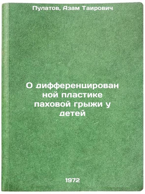 "Short description: In Russian. Pulatov, Azam Tairovich. On differential plasticity of inguinal hernia in children. Dushanbe: 1972. O differentsirovannoy plastike pakhovoy gryzhi u detey. In Russian/On differential plasticity of inguinal hernia in children. All images are for identification of editions only. Several books of the same edition may be available. Please feel free to request photos of available books. SKU7343639"