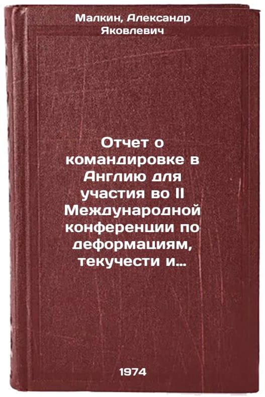 In Russian. Malkin, Alexander Yakovlevich. Report on a mission to England to participate in the II International Conference on Deformation, Fluidity and Depletion of Polymers, March 26-29, 1973, at Churchill College, Cambridge. Moscow: 1974. Otchet o komandirovke v Angliyu dlya uchastiya vo II Mezhdunarodnoy konferentsii po deformatsiyam, tekuchesti i razrusheniyu polimerov 26-29 marta 1973 g. v Cherchil-kolledzh v Kembridzhe. In Russian /Report on a mission to England to participate in the II International Conference on Deformation, Fluidity, and Depletion of Polymers, March 26-29, 1973, at Churchill College, Cambridge. All images are for identification of editions only. Several books of the same edition may be available. Please feel free to request photos of available books. SKU7351619