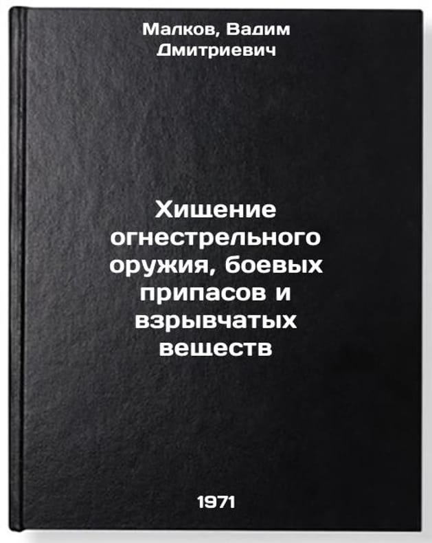 In Russian. Malkov, Vadim Dmitrievich. Theft of firearms, ammunition and explosives. Moscow: 1971. Khishchenie ognestrel'nogo oruzhiya, boevykh pripasov i vzryvchatykh veshchestv. In Russian /Theft of firearms, ammunition and explosives . All images are for identification of editions only. Several books of the same edition may be available. Please feel free to request photos of available books. SKU7351671