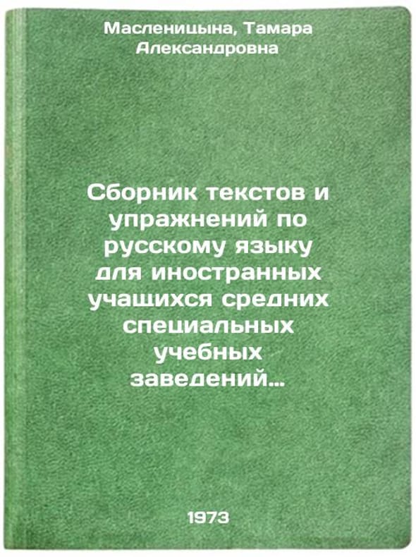 In Russian. Maslenitsyna, Tamara Alexandrovna. A collection of texts and exercises on the Russian language for foreign students of secondary specialized educational institutions (humanities). Moscow: Higher School, 1973. Sbornik tekstov i uprazhneniy po russkomu yazyku dlya inostrannykh uchashchikhsya srednikh spetsialnykh uchebnykh zavedeniy (gumanitarnogo profilya). In Russian/Compilation of texts and exercises on the Russian language for foreign students of secondary specialized educational institutions (humanities). All images are for identification of editions only. Several books of the same edition may be available. Please feel free to request photos of available books. SKU7355689